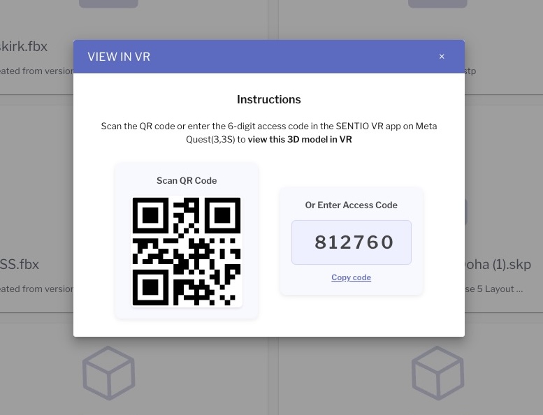 Tip: You can also use the VIEW IN VR button on the model card to generate a QR code for quick access.
