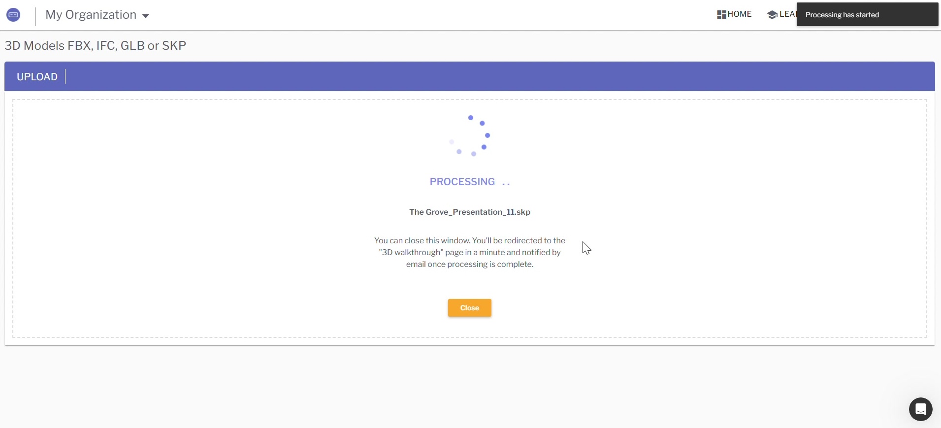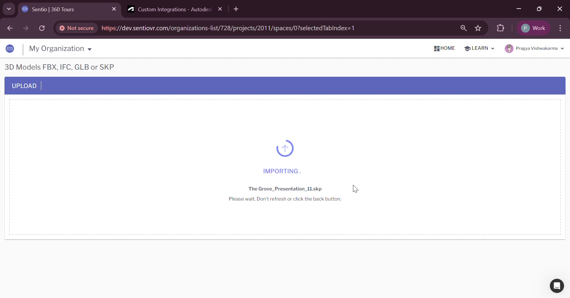 The file will now be imported and processed by Sentio. Processing time depends on file size and complexity. You can monitor progress on the 3D Walkthroughs page.