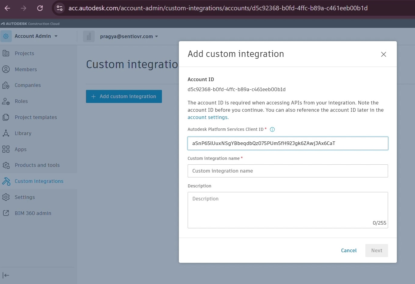📷 [Screenshot: ACC Custom Integrations page → Add custom integration dialog]