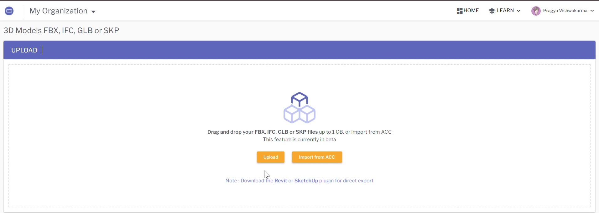 Note: The integration setup requires admin access on both platforms. Once the setup is complete, any user in the organization can import models from ACC.