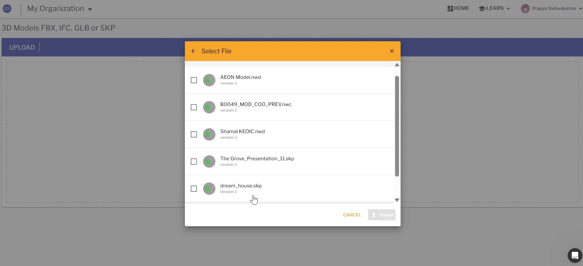 - In the Select Project dialog, choose the ACC project that contains your model