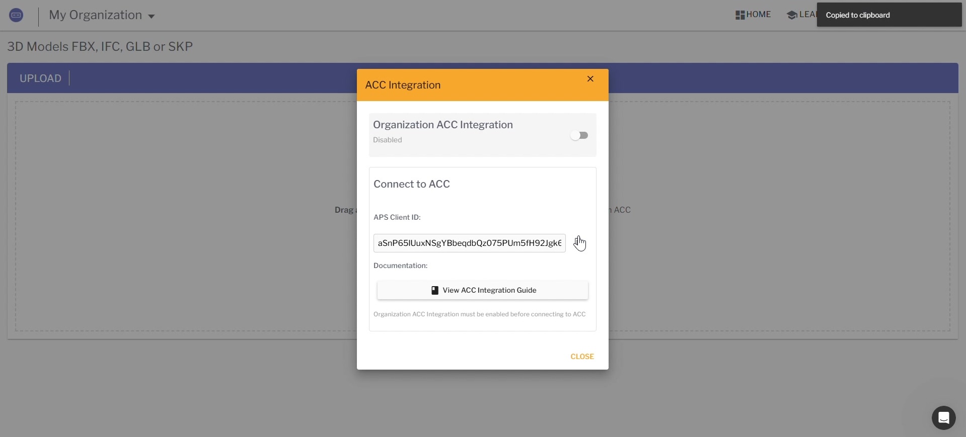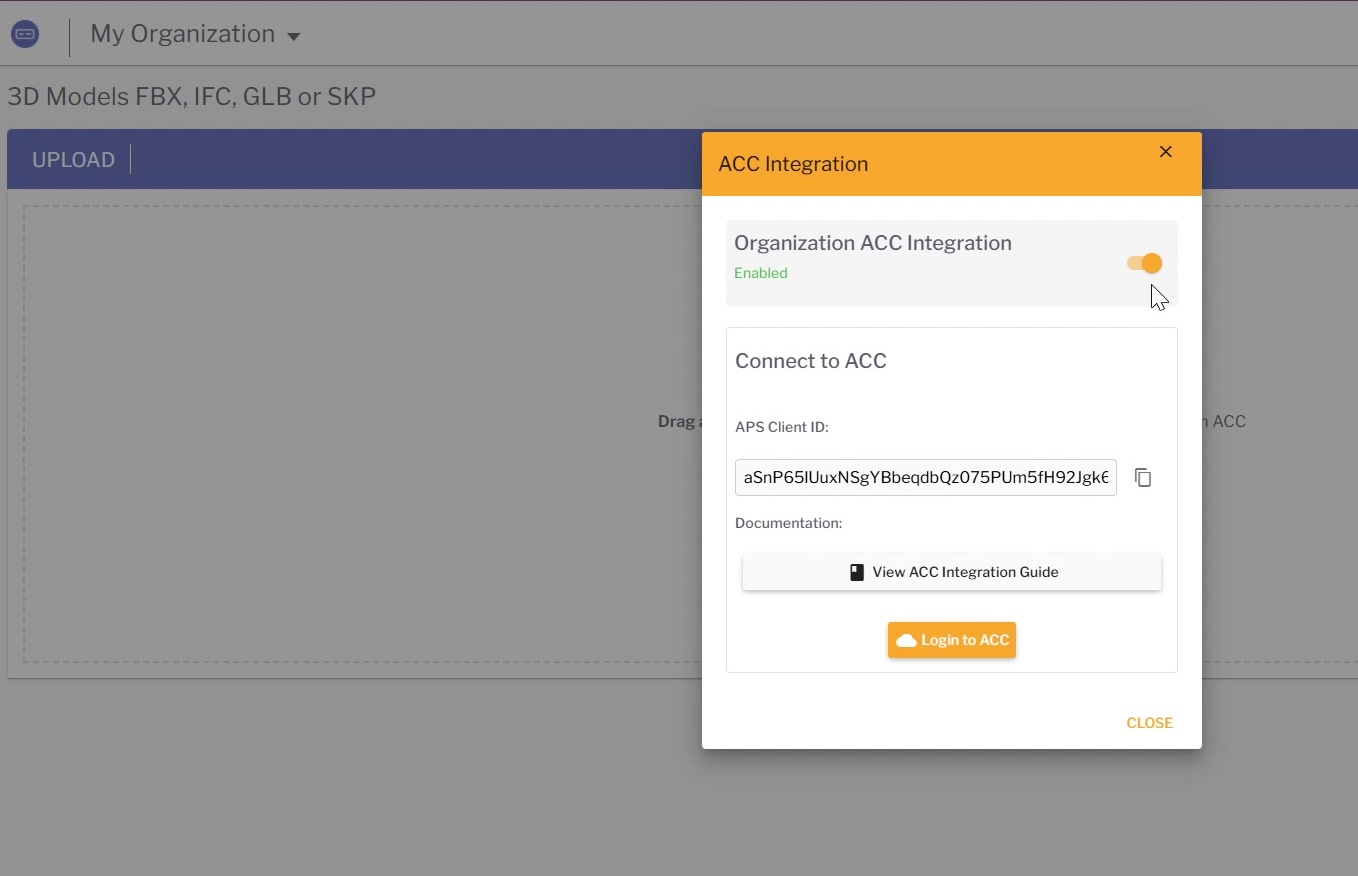 - In the ACC Integration dialog, toggle Organization ACC Integration to enabled